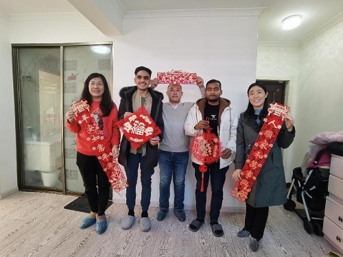 走访的第一站来到了布隆迪籍琳达、巴基斯坦籍卡瑞明和坦桑尼亚籍王娜3名女生的家,老师们亲切询问留学生的健康和学习生活情况,反复叮嘱3名女生一定要注意安全,提高自我保护意识。随后,老师们与留学生一起组装对联、福字、挂饰,并向留学生讲解春节习俗,让大家在浓浓的年味中感受中国传统文化。