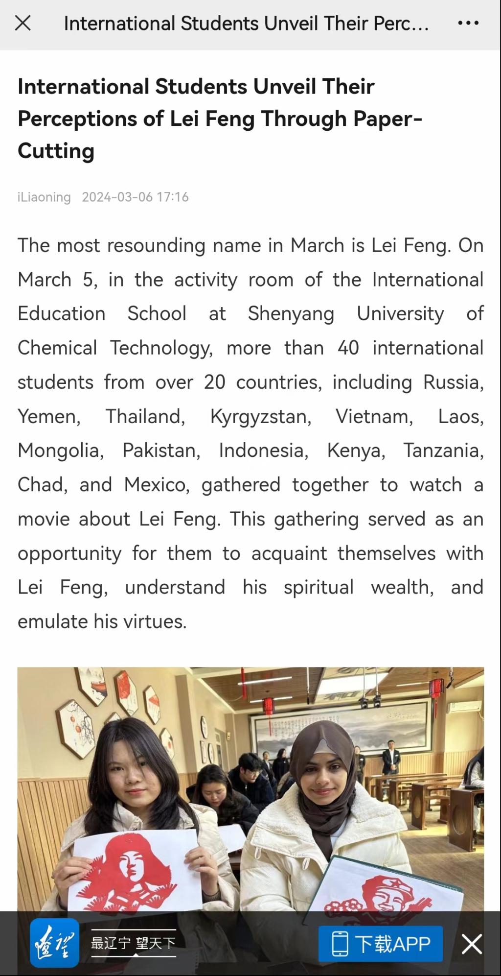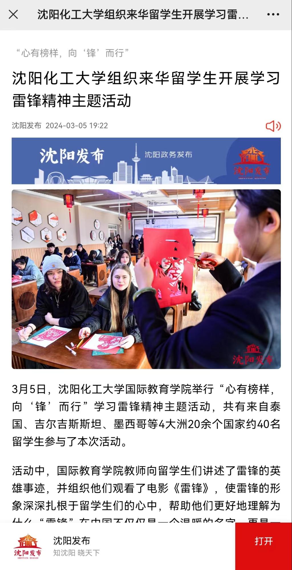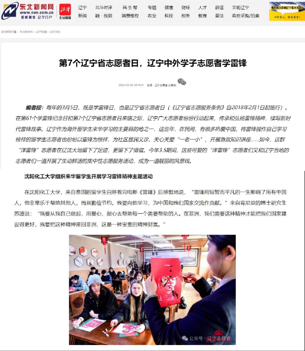 3月5日,在全国第61个学雷锋纪念日到来之际,best365国际教育学院组织来华留学生开展“心有榜样,向‘锋’而行”学习雷锋精神主题活动,共有来自俄罗斯、也门、泰国、吉尔吉斯斯坦、越南、老挝、蒙古、巴基斯坦、印尼、肯尼亚、坦桑尼亚、乍得、墨西哥等4大洲20余个国家约40名留学生参与其中。本次活动获得了东北新闻网、辽望客户端、沈阳日报、“沈阳发布”客户端、沈阳发布英文公众号、《中国日报》“留学中国”海外社交媒体平台、辽宁国际传播中心海外平台Facebook以及Twitter等多家省市级媒体的报道和转载。