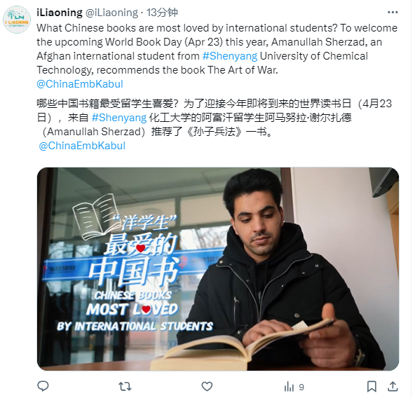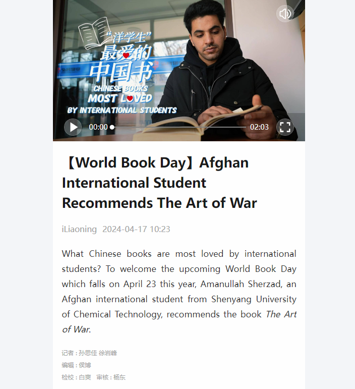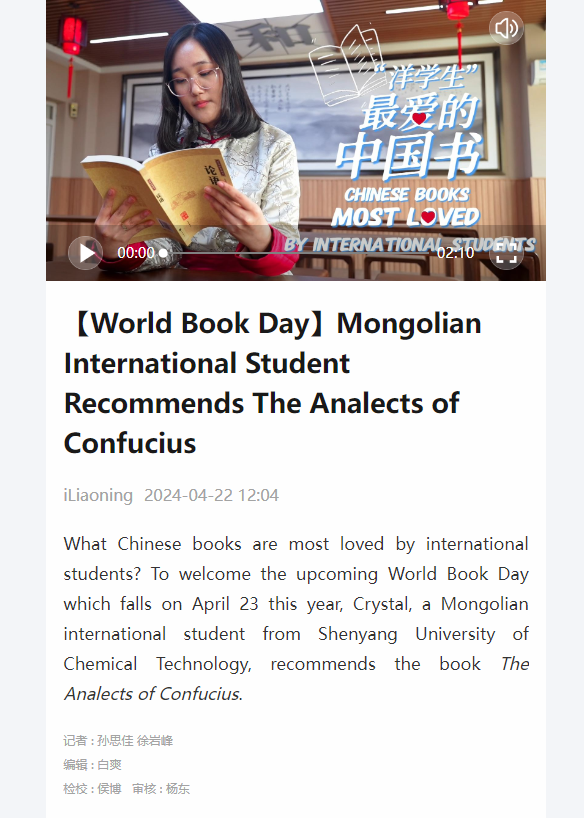 在世界读书日来临之际,best365留学生史泽城、水晶参加我最喜欢的中国书推荐活动在辽望客户端、辽宁国际传播中心海外平台Facebook、Twitte等媒体上发布。