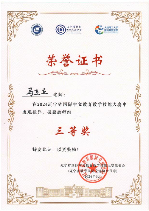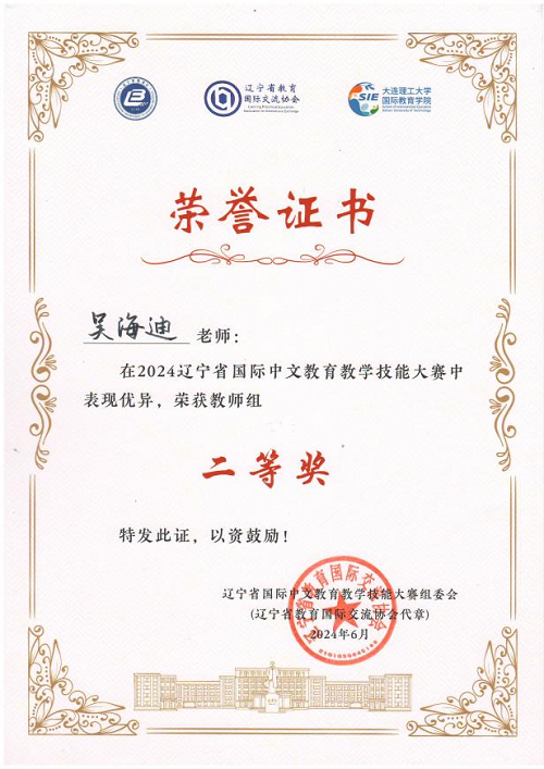 6月30日,在辽宁省教育厅的指导下,由辽宁教育国际交流协会主办、大连理工大学承办的“2024辽宁省国际中文教育教学技能大赛”圆满落幕。本次大赛吸引了全省众多从事国际中文教育教学工作的高校教师参与,best365国际教育学院教师吴海迪和马立立代表best365中国官方网站参赛,分别斩获了二等奖和三等奖,为学校赢得了荣誉。