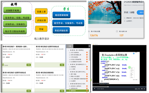 按照培养计划和教学大纲,将课程内容细化为不同模块。以授课视频展现知识点,以电子作业巩固所学,以单元测试见证学习质量,以上机实验培养编程能力。多层次准备、丰富教学资料,让学生感到随时有课可听可看,有业可做,有试可考,有机可上。