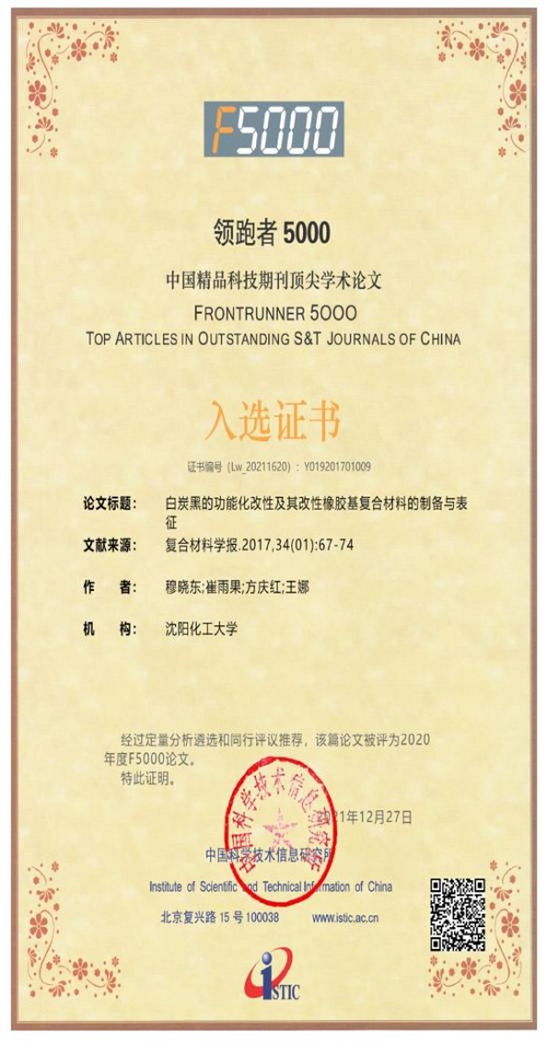 近日,材料科学与工程学院方庆红教授学科团队发表在《复合材料学报》2017年第34卷1期上的论文《白炭黑的功能化改性及其改性橡胶基复合材料的制备与表征》被中国科学技术信息研究所评为2020年度“领跑者5000—中国精品科技期刊顶尖学术论文(F5000)”。该论文第一作者为材料科学与工程学院研究生穆晓东同学,通讯作者为橡胶弹性体科研团队方庆红教授。该文通过自行合成白炭黑的原位改性,实现其与天然橡胶高效分散,有效提高了橡胶复合材料的静态与动态性能。