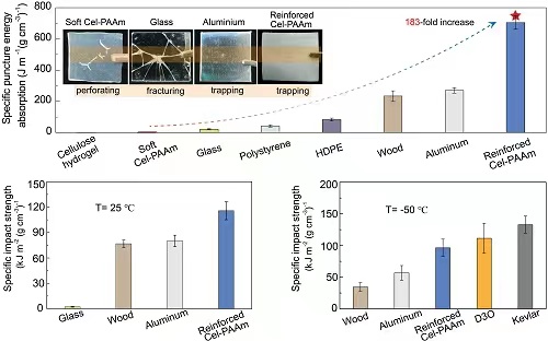 该智能Cel-PAAm材料可以在软-硬两种极端状态间实现可逆动态切换,且在外界刺激增强的状态下,Cel-PAAm材料展现出诸多优越机械性能,如(1)强悍类金属刚性,刚度值可达243.6 MPa,是软状态下的470倍之高;(2)卓越承载能力,可以承受超过其自身重量35000倍的物体;(3)优异抗刺穿性能,其比抗穿刺吸收能为704.9 ± 43.6 J m−1 (g cm−3)−1,优于常规的硬材料,如玻璃、木材及高密度聚乙烯毡,强度值甚至达到铝板的2倍(269.8 ± 17.5 J m−1 (g cm−3)−1);(4)极好冲击性能,材料比冲击强度可达116 kJ m−2(g cm−3)−1,优于很多金属及合金材料,甚至可与商用防护材料如D3O和Kevlar(凯夫拉)相媲美。