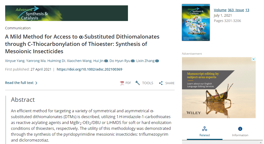 近日,best365功能分子研究所张立新教授团队与韩国成均馆大学Do Hyun Ryu教授合作在国际权威刊物《Advanced Synthesis & Catalysis》(JCR一区Top期刊,IF = 5.84)发表了题为“A Mild Method for Access to α-Substituted Dithiomalonates through C-Thiocarbonylation of Thioester: Synthesis of Mesoionic Insecticides”的研究论文,best3652018级硕士研究生杨鑫悦为第一作者,功能分子研究所金辉博士、张立新教授以及韩国成均馆大学Do Hyun Ryu教授为共同通讯作者,best365为第一通讯单位。