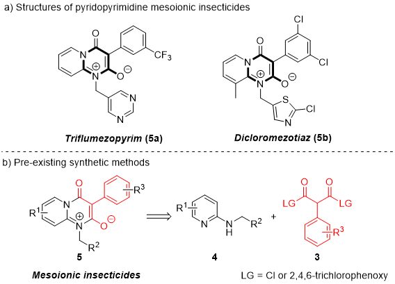 介离子类杀虫剂是杜邦公司开发的一种高效、低毒的新型杀虫剂,其中三氟苯嘧啶和Dicloromezotiaz已成功实现商品化,对水稻鳞翅目及半翅目害虫防效显著,是具有巨大应用潜力的新型杀虫剂。但目前对该类化合物的现有合成方法具有条件苛刻、产率低等缺点。因此研究高效合成介离子类化合物的新方法具有重要意义。
