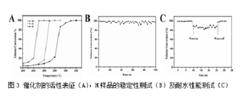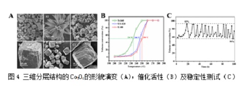 上述研究的结果表明,制备条件的改变会导致Co3O4催化剂物理、化学性质的显著变化。基于此,在上述研究的基础上,研究团队制备了结构新颖的三维分层结构的Co3O4催化剂。仅仅通过调控合成温度,就可使三维Co3O4刺球转变为页岩状,且成功捕获了形貌转变的中间态(图4A)。其中160 ℃(S-160)条件下制备的页岩状Co3O4催化剂的催化性能最好,甲苯转化率为T90%的温度为245 ℃。S-160样品优良的催化性能主要是由于其丰富的吸附氧和Co3+,以及良好的氧化还原性能。此外,S-160样品在甲苯浓度为 500ppm, GHSV 为 60000 mL·g-1·h-1, 5 vol.% H2O,240 ℃条件下,对甲苯的去除率稳定在95%左右,表现出了高效的甲苯去除效率及优秀的稳定性(图4B,4C)。该研究结果以“Controllable synthesis of 3D hierarchical Co3O4 catalysts and their excellent catalytic performance for toluene combustion”为题发表在《Applied Surface Science》杂志上(Applied Surface Science, 507, 2020, 145174)。