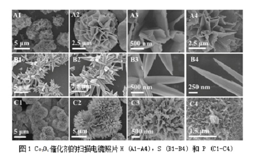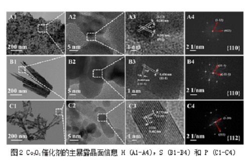 Co3O4是一种相对廉价的催化剂,但其完全去除甲苯或苯的温度往往超过300 ℃,不仅不够高效,而且浪费能源。针对Co3O4基催化剂催化活性及稳定性不足的难题,best365中国官方网站环境与安全工程学院张学军教授团队,定向合成了一系列形貌可控的Co3O4催化剂。通过优化制备方法,调控Co3O4催化剂的形貌、主暴露晶面、表面缺陷浓度、氧化还原性能等,达到高效且稳定去除苯系VOCs的目的。所得Co3O4催化剂的扫描电镜图片可以看出样品均是三维分层结构(图1),且表现出不同的主暴露晶面(图2)。