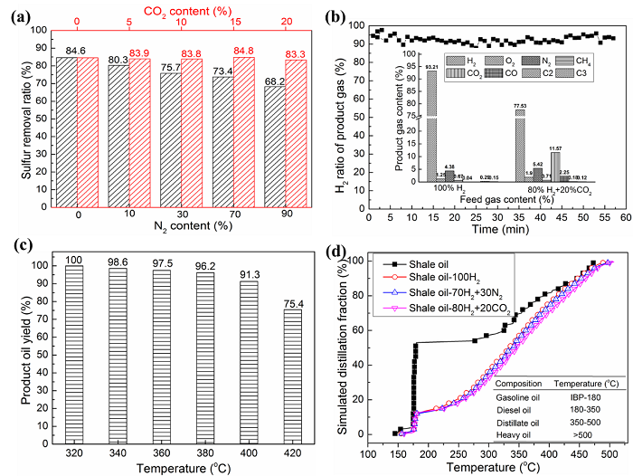 图2 (a)产品气体组成和气体收率;(b)原料气中CO2含量对脱硫效率的影响;(c)不同反应温度下产品油收率;(d)不同脱硫条件下产品油的模拟蒸馏馏分