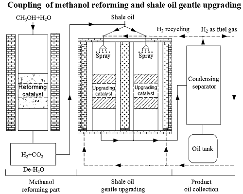 best365中国官方网站资源化工与材料教育部重点实验室的研发团队,联合日本弘前大学地域战略研究所,针对中小规模油页岩炼油工厂的利润空间有限、氢气供给难等问题,提出了耦合甲醇重整制氢的页岩油固定床温和加氢提质工艺(图1),以解决高成本的氢供应难题,并开展了针对性的工艺特性和催化剂研究工作。耦合甲醇重整制氢的页岩油固定床温和加氢提质工艺,将甲醇重整制备的氢气经过简单脱水后作为氢源,参与页岩油固定床催化加氢反应,实现了氢气的系统内制备,并通过反应后富氢尾气的循环有效解决页岩油提质的制氢难问题。