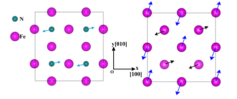 图1: 对于γˊ-Fe4N原胞2×2×1的扩胞后,在XY平面(即[100]-[010]平面)上按虚频对应的极化向量方向对于Fe和N原子做了移动示意图.