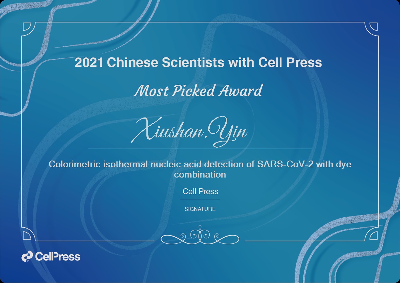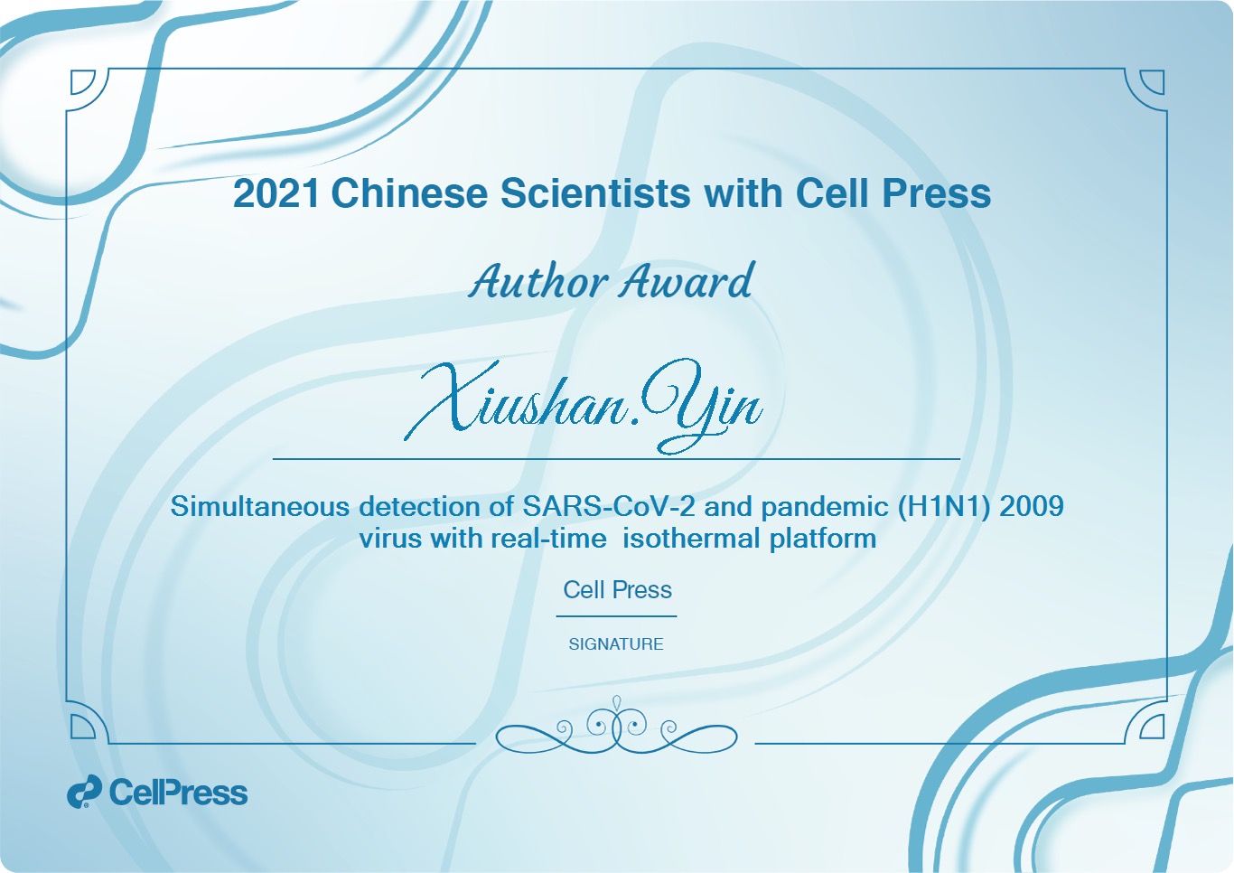 2022年11月22日,经国际知名全学科学术出版机构——细胞出版社(Cell Press)展示,best365应用生物学研究所尹秀山教授团队两项科研成果【Colorimetric isothermal nucleic acid detection of SARS-CoV-2 with dye combination】、【Simultaneous detection of SARS-CoV-2 and pandemic (H1N1) 2009 virus with real-time isothermal platform】荣获交叉学科领域“细胞出版社 2021年度最受欢迎中国论文”。