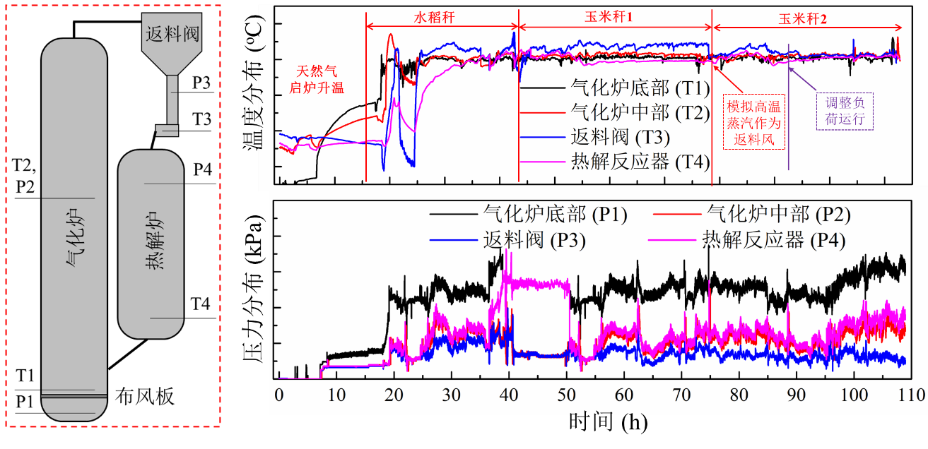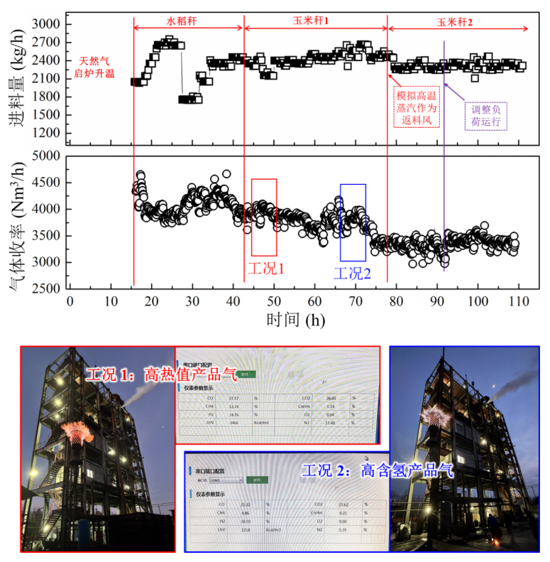 流化床两段空气气化生产燃气技术已成功应用于中药渣、白酒糟等轻工过程的生物质废物,在河南、四川、山东、安徽等地建成了年处理工业生物质废物万吨至5万吨级的多套产业化应用工程,有效实现了气化燃气焦油含量低于50 mg/Nm3的国际先进技术指标。本次工业试验的主要任务是:验证常压流化床两段气化工艺在多种生物质原料富氧气化(氧气+空气+水蒸气为气化剂)制高品质燃气、纯氧气化(氧气+水蒸气)制合成气方面的技术可行性与装置运行的连续稳定性。工业试验使用山东本地水稻秆、玉米秆的成型颗粒燃料(表1示),通过匹配反应条件与氧气/水蒸汽的供给,气化系统温度稳定在750-880 oC的范围内,最长连续稳定操作时间超过110小时(图2示)。