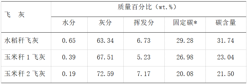 注:飞灰为实验结束后空气基,*固定碳含量由差减法计算得到,碳含量为元素分析结果。