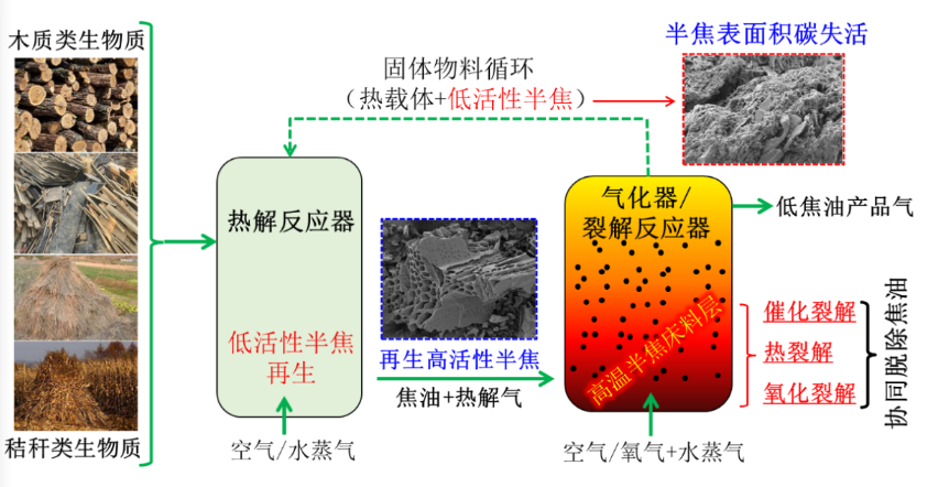 best365中国官方网站许光文教授团队联合济南黄台煤气炉有限公司,创新建造了年万吨级流化床两段气化工业试验装置,其利用流态化反应器实现燃料热解与半焦气化/焦油裂解反应的解耦与重构,形成生物质半焦的“催化”与“再生”完整循环(图1示),在快速流化床反应器中协同生物质焦油热裂解、氧化裂解、高温半焦催化裂解的作用,促成在反应体系中的焦油深度脱除,实现生物质气化制低焦油燃气或合成气的技术目标。发挥流态化反应器中高效传递与反应的技术优势,创新的生物质气化技术对高含湿、低热值生物质燃料具有独特的适应性。