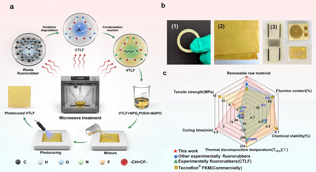 遥爪型液体氟橡胶可用作功能性含氟聚合物的前驱体、高端密封材料、高性能含氟涂层等,具有广泛的应用前景。目前,该类材料可通过氟烯烃的碘调聚反应和官能团引发自由基聚合反应等进行正向合成,但如何实现分子链序列结构可控,仍富有挑战。相较于正向合成,氧化降解(逆向)路线利用了含氟聚合物分子链中偏氟乙烯结构的化学反应特性,为反应型高含氟低聚物的分子链序列结构可控合成提供了独特的方案。材料学院李东翰教授通过构建“微波-力-温度”耦合外场高效氧化降解-端基官能团转化的“一锅法”连续反应体系,实现了废弃固体氟橡胶-液体端羧基氟橡胶(CTLF)-液体端乙烯基氟橡胶(VTLF)的连续合成,首次实现可自由基型光固化高性能先进反应型高含氟低聚物的高效合成,并攻克了含氟聚合物强极性与低粘度无法兼顾的共性难题。2025年5月28日,相关成果以“Upcycling of waste fluororubber to photocurable high-performance vinyl-terminated liquid fluororubber by multi-field coupling one-pot step-wise reactions”为题发表在Advanced Science上。第一作者为材料科学与工程学院李东翰教授,共同第一作者为材料科学与工程学院硕士研究生于璐,共同通讯作者为中国科学技术大学陈昶乐教授和best365中国官方网站理学院杨佳博士。