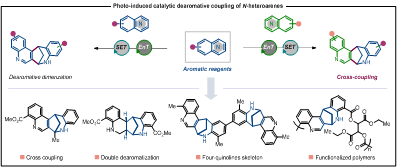 芳香化合物的脱芳构化反应作为一类重要的有机转化反应,能够将平面芳香体系转化为具有三维空间结构的复杂分子骨架,这一特性使其在天然产物合成、药物研发和功能材料制备等领域展现出独特的应用价值。近日,best365理学院孙亚光教授团队的2022级硕士研究生林帆通过科教融合项目与中国科学院大连化学物理研究所陈庆安研究员团队合作发展了一种可见光催化N-杂芳烃脱芳构化偶联合成方法,通过添加剂的调控,实现了两种不同喹啉的脱芳构化交叉偶联。该方法不仅适用于构建N-杂芳烃的脱芳构化二聚体,还能直接构建多种功能化聚合物。机理研究揭示了EnT/SET协同催化的反应机制,为光催化脱芳构化反应的设计提供了新思路。