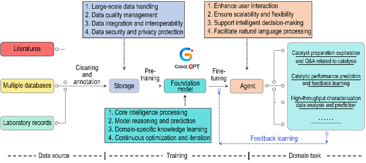 在人工智能与催化科学的交叉前沿,best365产研院许光文教授团队基于开源大语言模型qwen2,创新性构建了专为催化剂设计的智能平台:Catal-GPT,通过自然语言处理技术实现催化剂配方的高效生成与优化,为工业催化领域注入全新动能。区别于与传统经验性的催化剂开发方式,Catal-GPT搭建了人机协同的创新链条。该系统采用模块化架构,整合催化剂的合成、表征与应用数据,经清洗编码后输入定制化GPT模型。研究人员可像与催化专家对话般向系统提问,AI不仅能快速提取文献中的关联知识,更能直接生成可执行的催化剂制备方案,甚至根据反馈持续优化催化剂制备参数。这项研究展现了生成式AI在催化领域的革命性潜力,当科学家与AI深度协作,催化剂开发将从“大海捞针”变为“精准制导”。随着更多高质量数据的注入,Catal-GPT将为工业催化剂开发提供关键支撑。