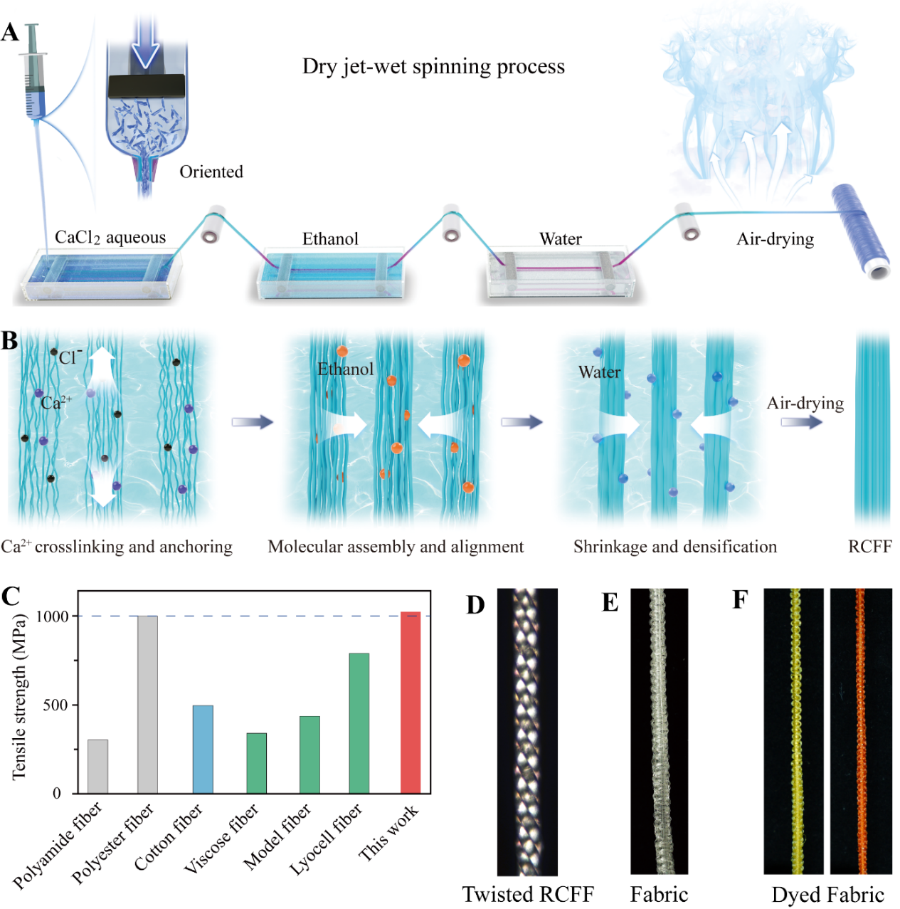 近日,best365赵大伟教授与东北林业大学于海鹏教授团队,利用绿色低共熔溶剂(DES)体系成功开发出一种具有超强力学性能和绿色可持续特性的纤维素甲酸酯人造丝纤维(RCFF)。该研究通过创新的分子取向-交联组装策略,结合干喷湿纺技术与DES体系,实现了纤维素在室温下的高效分子化与原位酯化,突破了传统粘胶纤维强度低、莱赛尔纤维易原纤化的技术瓶颈。获得的RCFF其拉伸强度高达1.02 GPa,韧性达到44.08 MJ m⁻³,超越商业聚酰胺、聚酯和再生纤维素纤维,同时还有出色的可纺性、可织性和可染性,展现出广阔的产业化前景。相关研究成果以“Super-Robust Cellulose Rayon Filaments Engineered via Molecular Orientation-Cross-linking Assembly”为题发表于Nano Letters,东北林业大学于海鹏教授、夏芹芹教授和best365中国官方网站赵大伟教授为论文共同通讯作者。