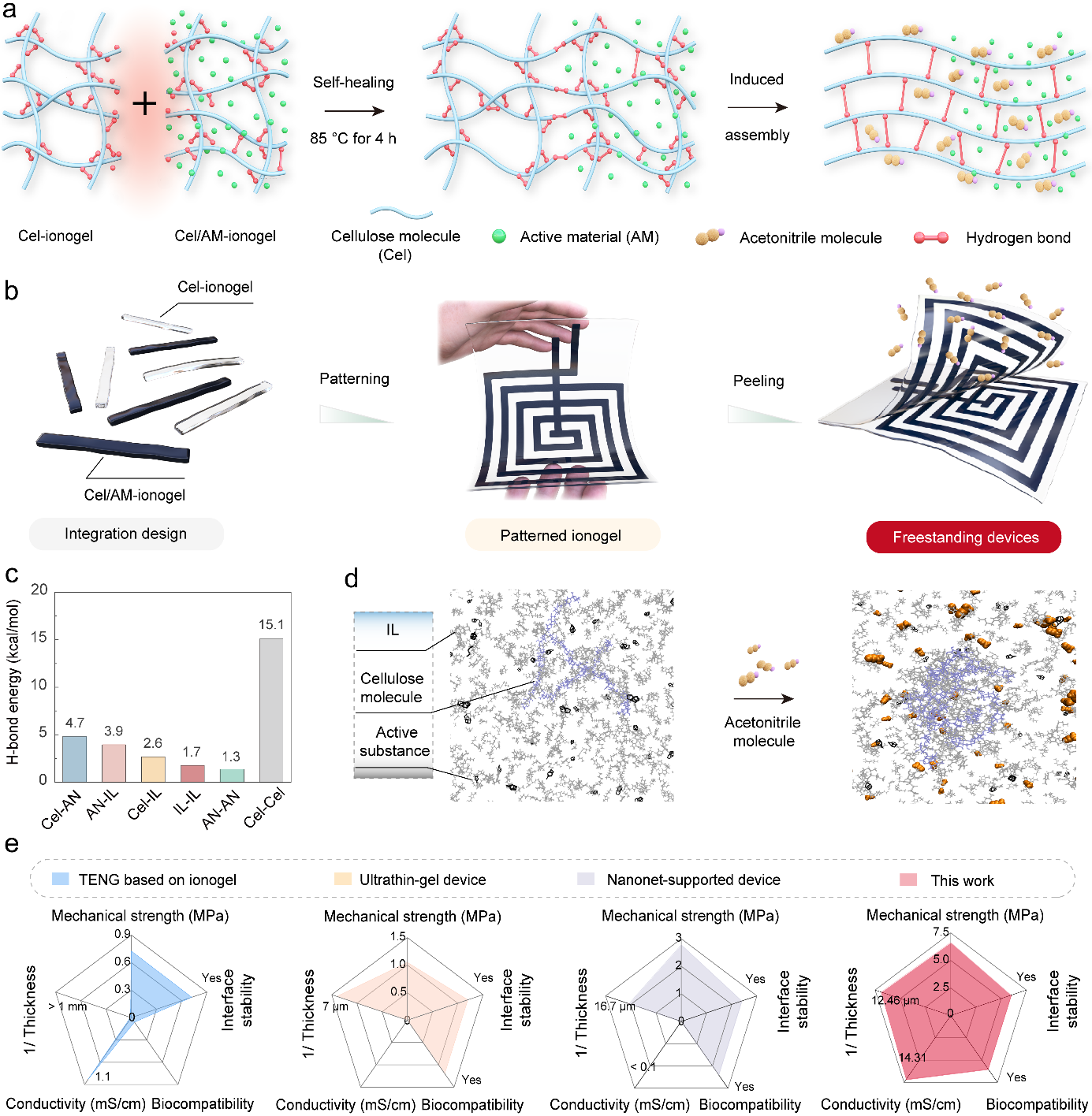 纤维素作为一种天然多糖聚合物,广泛存在于木材、竹材等生物资源中。随着,石化资源的消耗及伴随的环境、生态、健康等问题,生物质纤维素及衍生材料的高品质设计与高值化利用受到越来越多的关注。基于团队前期的纤维素膜剥离研究基础(Nature Synthesis, 2023, 2(9): 864-872),best365赵大伟团队联合东北林业大学于海鹏教授,突破了活性物质种类、颗粒尺寸几乎不受限制的图案化纤维素离子凝胶器件的快速(约10 s)、超薄(厚度12.46 µm,约为发丝的1/9)、可控剥离制备(厚度、形貌均可控)。得益于活性物质(PEDOT、MOF、MXenes、活性炭、Ni粉等)与纤维素分子链间的物理缠绕及氢键作用,获得的图案化超薄器件呈现出稳定的界面结构(耐沸水、剥离等)、高的机械性能(拉伸强度6.5 MPa)、高的压力灵敏性(75.82 kPa-1)及低的神经阻抗(5.83 Ω at 1 kHz),在柔性电子皮肤、生物医疗健康、神经网络修复等领域具有巨大潜力。