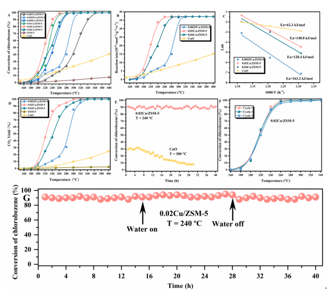 研究显示,0.02Cu/ZSM-5在240 ℃即可实现90%氯苯转化,并在连续40小时运行中表现出优异稳定性;相比之下,过量负载(0.04 mol/L)易生成CuO团聚体,覆盖活性位并抑制氧迁移,导致性能下降(下图A、E与G)。