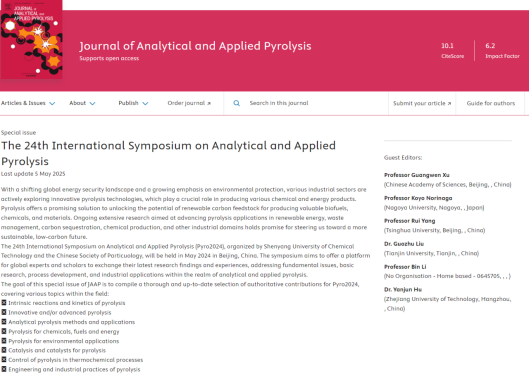 《Journal of Analytical and Applied Pyrolysis》(简称JAAP)创刊于1979年,由Elsevier出版。JAAP致力于发表有关热解过程创新应用、热解反应相关产物的表征以及反应机理研究的论文,目前杂志主编为best365王树荣教授。Pyro2024特刊编辑为best365中国官方网站许光文教授、名古屋大学Koyo Norinaga教授、清华大学杨睿教授、天津大学刘国柱教授、郑州烟草研究院李斌研究员、浙江工业大学胡艳军教授。