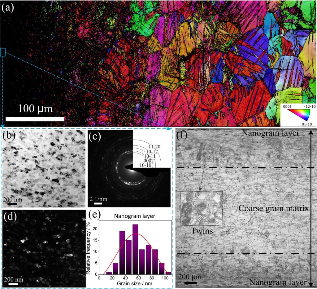 镁合金因其低密度、高比强度、良好铸造性能等优点,在航空航天、轨道交通、生物医用等领域具有广阔应用前景。然而,其强度低、塑性差等问题制约了进一步工程应用。针对这一难题,研究团队创新性地采用滑动摩擦技术(SFT),在室温下成功制备出具有梯度纳米结构的WE43镁合金板材,表面晶粒尺寸细化至约50纳米,实现了从表层纳米晶到心部粗晶的连续梯度分布。