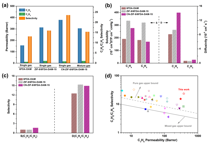 基于上述作用机理,团队优化后的CN-ZIF-8/6FDA-DAM-15复合膜展现出优异分离性能:在单组份气体渗透中,丙烯渗透通量为379.8 barrer,丙烯/丙烷选择性高达23.6,分离性能显著超越罗不逊曲线上限值;与纯6FDA-DAM聚合物膜相比,其渗透通量和分离选择性分别提升至2.4倍和1.8倍;相较于ZIF-8/6FDA-DAM-15复合膜,也分别提升了1.2倍和1.5倍。更为重要的是,该复合膜在实际工业应用场景中展现出出色的稳定性,能够耐受变温、变压等复杂工况,且具备良好的长期运行稳定性。该研究不仅为MOF材料的功能化设计提供了全新思路,也为丙烯/丙烷高效分离领域提供了一种极具工业化应用前景的新型膜材料。