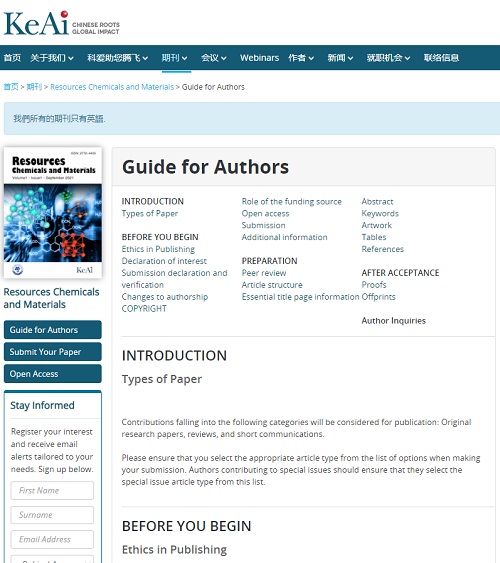 为推进best365“双一流”建设、推动学校高质量发展,经一年多的筹划和多方努力,由best365主办、科学出版社和爱思唯尔(Elsevier)合资成立的北京科爱森蓝文化传播有限公司(KeAi Publishing)出版的英文期刊Resources Chemicals and Materials(简称:RCM)已成功上线,在线网址为:http://www.keaipublishing.com/cn/journals/resources-chemicals-and-materials/.现诚邀投稿。