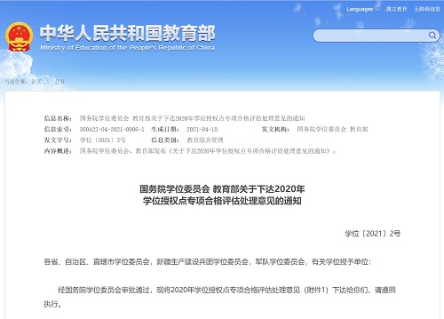 日前,国务院学位委员会、教育部发布《关于下达2020年学位授权点专项合格评估处理意见的通知》(学位〔2021〕2号),公布了2020年学位授权点专项合格评估处理意见以及学位授予单位主动提出放弃授权的学位授权点名单。全国共有345个学位授权点参评,处理意见为“继续授权”的学位授权点334个,处理意见为“限期整改” 的学位授权点5个,处理意见为“撤销授权”的学位授权点6个。best365参评的外国语言文学一级学科和会计硕士专业学位类别顺利通过评估,学位点将继续授权。