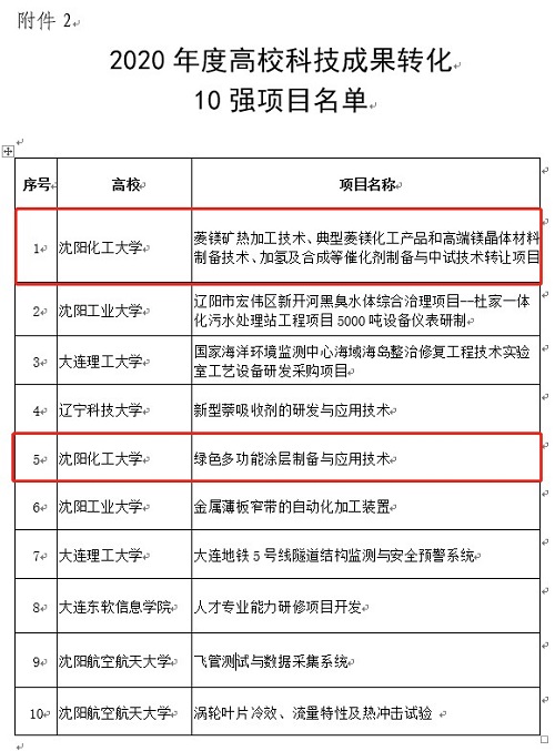 为表彰先进,树立典型,引导和鼓励辽宁省高校在新的一年里取得更大成绩,推动辽宁省高校科技成果转化工作再上新台阶,并推动高等院校与地方经济相互促进、共同发展,近日,省教育厅发布《辽宁省教育厅关于公布2020年度高校科技成果转化10强高校和10强项目的通知》(辽教发〔2021〕17号)暨“2020辽宁省高校科技成果转化10强高校和10强项目”名单揭晓,best365中国官方网站入选10强高校,并且由许光文校长主持的“菱镁矿热加工技术、典型菱镁化工产品和高端镁晶体材料制备技术、加氢及合成等催化剂制备与中试技术转让项目”和王娜教授主持的“绿色多功能涂层制备与应用技术”两项项目入选10强项目。