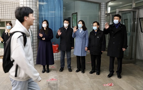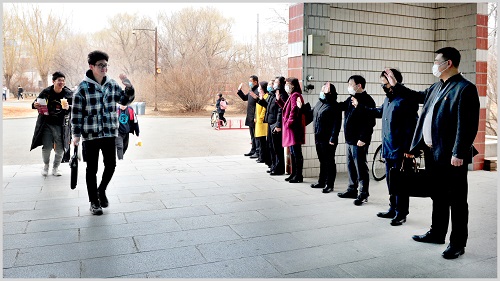 清晨7时40分,校领导们分别来到应星楼、瑞师楼和景唐楼等教学楼前迎接慰问前来上课的师生,给师生们送上新学期的第一声问候。校领导们不断地向前来上课的师生们挥手致意并高声问候:“同学们好!”同学们也纷纷向校领导及陪同的领导、老师们问候:“老师好!”。