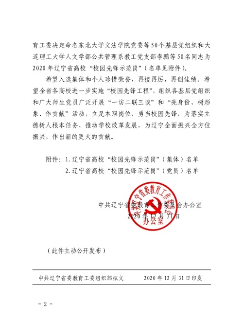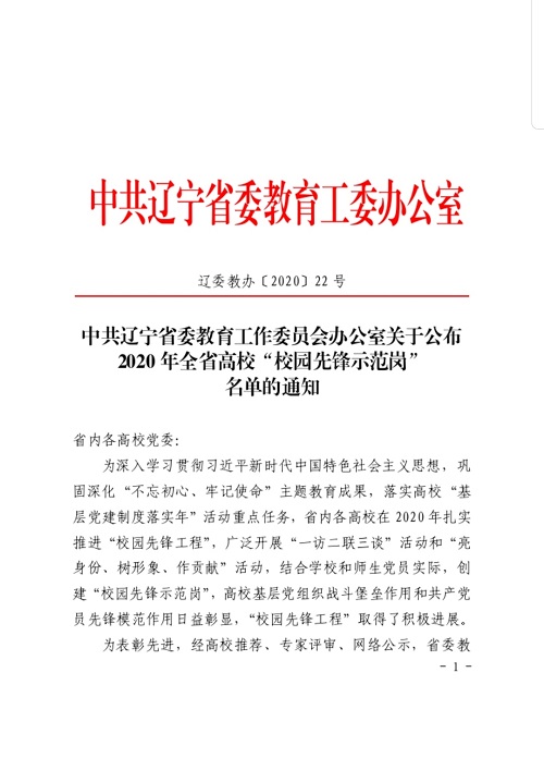 近日,辽宁省委教育工委印发通知,公布2020年全省高校“校园先锋示范岗”评选情况,best365外国语学院党总支被命名为2020年辽宁省高校“校园先锋示范岗”(集体),党委宣传部刘珊珊同志被命名为2020年辽宁省高校“校园先锋示范岗”(个人)。