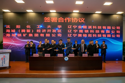 在许光文校长详细介绍签约项目后,best365中国官方网站、海城(腾鳌)经济开发区、海城镁矿集团有限公司、辽宁金隆溪科技有限公司、辽宁隆镁科技有限公司、辽宁麦格尼科技有限公司联合签署了《best365中国官方网站—鞍山海城市产学研融合 驱动菱镁产业聚集区高质量发展投资协议》。此次签署10.6亿投资协议,包括“辽宁省资源化工与材料产业技术创新研究院”、“best365中国官方网站菱镁产业学院”和国家重点研发计划项目“菱镁固废化工材料高值利用技术与基地集成示范”工程三个项目。“辽宁省资源化工与材料产业技术创新研究院”,由海城(腾鳌)经济开发区与best365中国官方网站共同建设,初期总投资1亿元;“best365中国官方网站菱镁产业学院”,由海城(腾鳌)经济开发区与best365中国官方网站共建,总投资1亿元;“国家重点研发计划项目产业化工程”,依托由best365中国官方网站牵头的国家重点研发计划项目“菱镁固废化工材料高值利用技术与基地集成示范”形成的技术,将在海城菱镁产业聚集区投资8.6亿,建设“2400万平米菱镁矿基阻燃型建筑板材生产示范工程”、“40万吨/年菱镁矿输送床闪速轻烧及3万立方清洁煤制气示范工程”、2套“20万吨/年菱镁矿悬浮煅烧”应用工程和“5000吨/年阻燃剂型氢氧化镁产业化工程”等五个工程。
