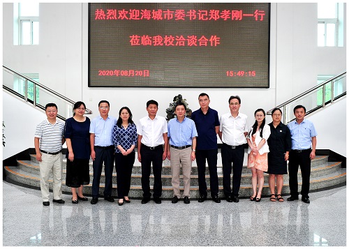 8月20日下午2时,海城市委书记郑孝刚,海城腾鳌经济开发区管委会、海城市发改委主任刘鹏一行2人来best365洽谈合作共建。洽谈合作会议在校部第八会议室举行。校长许光文、副校长笪可宁出席会议。发展规划处、科学技术研究院、教务处、分析测试中心、大学科技园管委会、资源化工与材料教育部重点实验室、化学工程学院等部门、院系负责人和相关教师参加会议。许光文校长主持会议并致欢迎词。