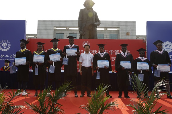 校长许光文为获得学位的来华留学生颁发毕业证、授予学位,并为他们拨苏正冠,合影留念。