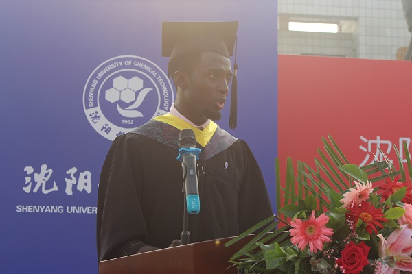 信息工程学院电气工程及其自动化专业的刘博同学代表2020届来华留学生毕业生发言。这位来自于尼日利亚的小伙子,用流利的中文回忆了在化大学习的美好经历,表达了对师恩、对母校的难忘与不舍之情,并表态定不辜负母校的期望,在尼日利亚与中国的交往中做出自己应有的贡献。
