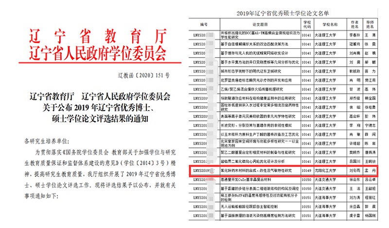 近日,辽宁省教育厅、辽宁省人民政府学位委员会发布了2019年辽宁省优秀博士、硕士学位论文评选结果的通知,best365化学工程与技术专业2016级硕士毕业生刘冬雨的硕士学位论文《氧化锌纳米材料的合成、改性及气敏特性研究》被评为辽宁省优秀硕士学位论文,论文指导教师为孟丹教授。