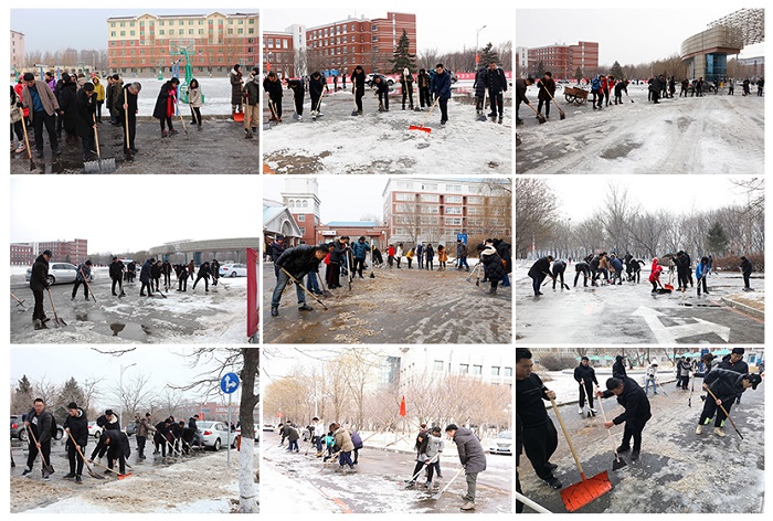 虽然是周六,中午12时30分,全体校领导和教工党员都准时赶到各任务点开始劳动。大家拿着铁锹、扫帚、冰铲等工具,认真地对校园及大学生生活城里的道路及活动场所的冰雪进行清理。校园内到处都响起了“咣咣”的铲冰声响,一派热火朝天的劳动景象。许多积雪被踩出一层厚冰极难清除,前排的教工挥动冰铲、铁锹奋力将厚冰砸碎,后排的教工用手推式除雪铲、扫帚将冰雪铲至路边。虽然数九寒天,大家的脸和手早已被冻得通红,有的人手上磨起了水泡,但大家依然干劲十足,形成了雪地上一道亮丽的风景线。