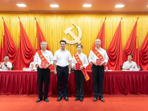 党委书记王强为荣获“光荣在党50年”纪念章的老党员代表王希民、李玉琴、李庆禄颁发纪念章。
