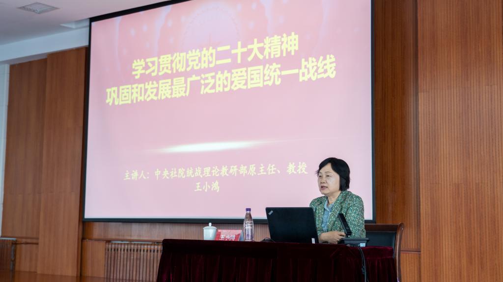 王小鸿教授以《学习贯彻党的二十大精神,巩固和发展最广泛的爱国统一战线》为题,围绕深刻领悟“两个确立”的决定性意义、深刻认识统一战线在实现中国式现代化中的地位和作用、深刻理解党的二十大对统一战线本质要求的新表述、深刻把握社会主义民主政治的本质属性、深刻领会党的二十大对统一战线的新要求等五个方面进行深入解读。她表示,统一战线是凝聚人心、汇聚力量的强大法宝,要牢牢把握新时代爱国统一战线的历史方位和重要使命,进一步完善大统战工作格局,为全面建设社会主义现代化国家、全面推进中华民族伟大复兴而团结奋斗。