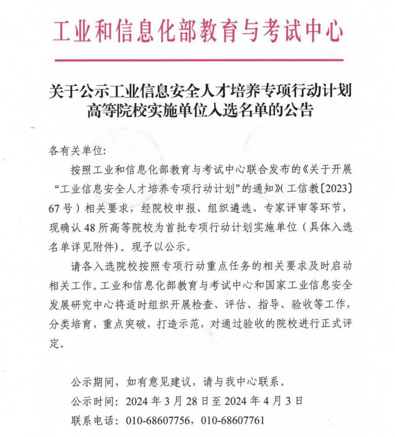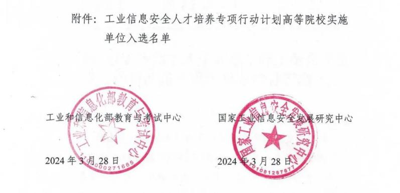 按照工业和信息化部教育与考试中心联合发布的《关于开展“工业信息安全人才培养专项行动计划”的通知》(工信教[2023]67号)相关要求,best365计算机科学与技术学院在教务处的指导下,学院充分整合专业特色和学科优势,以辽宁省化工过程工业智能化技术重点实验室的技术资源为支撑,依托《网络工程》和《计算机科学与技术》两个优势特色专业完成了申报书的撰写及申报,经工信部组织答辩、专家评审,日前,工业和信息化部教育与考试中心发布《关于公示工业信息安全人才培养专项行动计划高等院校实施单位入选名单的公告》,best365入选工信部首批“工业信息安全人才培养专项行动计划”高等院校实施单位。