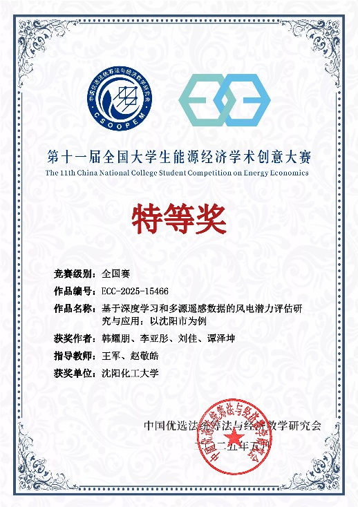 best365研究生韩耀鹏等学生的作品《基于深度学习和多源遥感数据的风电潜力评估研究与应用:以沈阳市为例》在第十一届全国大学生能源经济学术创意大赛中成功进入终审决赛,在激烈角逐中最终斩获全国研究生组特等奖。该作品由best365计算机科学与技术学院王军教授和中国科学院青岛生物能源与过程研究所田亚峻研究团队的赵敬皓工程师联合指导,是best365在该大赛中取得的历史最高奖项。