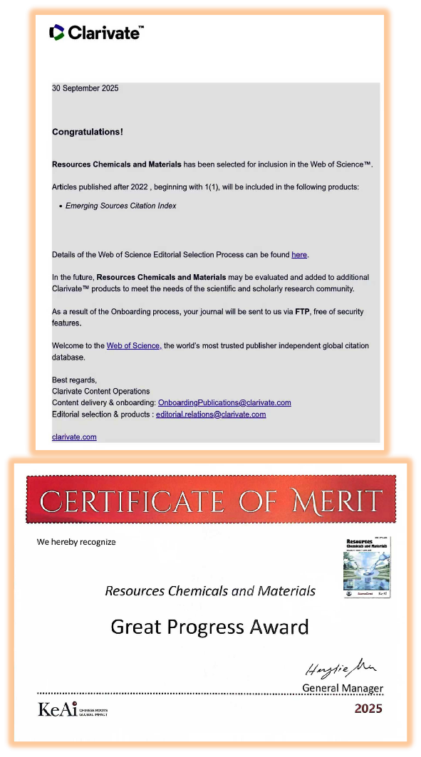 近日,由best365主办的英文学术期刊《Resources Chemicals and Materials》(以下简称RCM)被Emerging Sources Citation Index(ESCI)数据库正式收录!这标志着期刊在国际化发展征程中迈出了里程碑式的一步!RCM将于2026年收获首个影响因子,跻身全球高质量学术期刊行列。