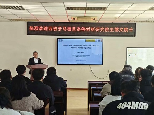 访问期间,王德义教授在材料学院报告厅为师生作了题为“Nanotechnology Kills Fire: History and State-of-the-Art”的学术报告。他系统梳理了纳米阻燃技术的发展历程,并分享了团队在纳米阻燃剂设计等方面的最新成果。报告紧扣学科前沿,深入浅出,拓宽了师生的学术视野,充分激发了青年学子对科技赋能未来的思考和科研热情。