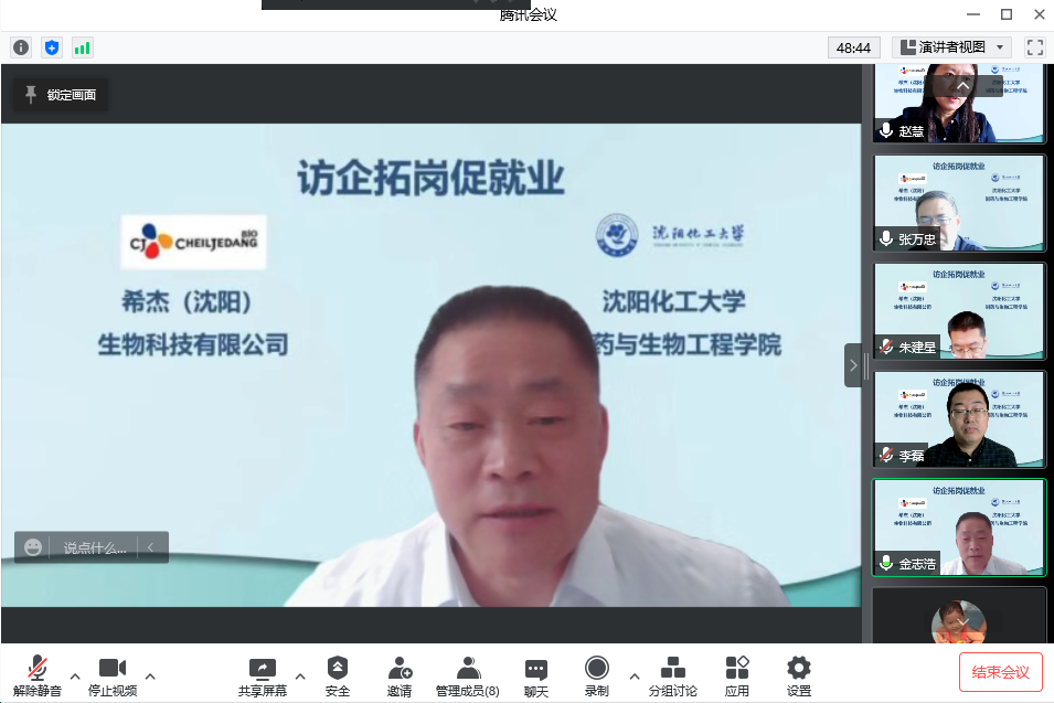为积极响应“全国高校书记校长访企拓岗促就业专项行动”,深化校企人才培养合作机制,开拓毕业生就业新渠道,实现毕业生充分、高质量就业,制药与生物工程学院于2022年5月17日开展访企拓岗促就业专题视频会议。希杰(沈阳)生物科技有限公司人力资源总监冯广宇、人力资源招聘经理金凤阳、学校校友氨基酸生产科经理孙占傲参加了视频连线会议。副校长金志浩和制药与生物工程学院相关人员参加了会议。会议由学院党总支书记赵慧主持。