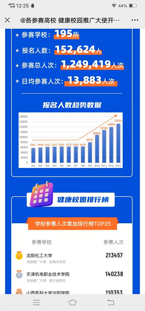 为坚持“健康第一”的教育理念,增强大学生体质健康,培养大学生锻炼习惯,中国大学生体育协会和阿里体育有限公司联合承办了中国大学生健康校园大赛暨AI体能赛。第一期比赛日期为2021年12月27日至2022年3月27日,共计13周,全国有195所高校参加了以学校为单位的团体赛,在13周的比赛中best365有11周排名第一,最终获全国总成绩团体第一名。