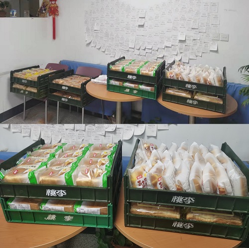 疾风知劲草,患难见真情。与在校留学生进行日常交谈时,老师们得知学生们对面包等食品迫切需求,随后紧锣密鼓、立刻行动,外国语学院李辉老师火速联系桃李食品有限公司,商谈落实相关细节,经过多方大量且高效的沟通和协调,新鲜丰富的面包安全送至学生们的手中,爱和温暖直抵人心。