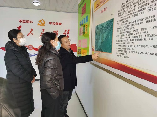 在门家网村党群服务中心,孟宪梅书记与东城街道党工委副书记王秀、东城街道党办副主任龚一丹和村两委班子等座谈交流,详细调研了解驻村干部的工作生活情况。王秀副书记对孟书记一行到来表示诚挚欢迎,评价韩世迁同志工作角色转变快、各项工作走在前做表率、深入调研得到村民认同,感谢学校派出真正扑下身子服务美丽乡村建设的驻村干部。驻村第一书记韩世迁同志从抓班子带队伍助力美丽乡村建设、勤走访做实事拉近与百姓距离、未来工作设想等方面做了工作汇报。