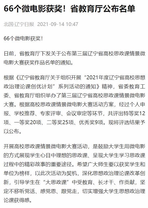 近日,由辽宁省教育厅主办的2021年第三届辽宁省高校思政课情景微电影大赛评选结果揭晓,best365马克思主义学院孔凡飞老师指导的参赛作品《遇见》荣获大赛一等奖。