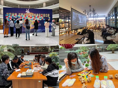 图书馆二楼大厅设立的灯谜展板上贴满了灯谜,谜语涵盖了生活常识、党史知识、传统文化及成语谚语等内容,兼具知识性和趣味性。猜灯谜活动吸引了300多人次的同学参加,让同学们既开动了脑筋,又学习到了许多平常并不了解的知识,开阔了眼界,更多了解了中国传统文化及其魅力。图书馆二楼大厅设立的益智类游戏区为同学们准备了多种益智类玩具和棋类游戏。同学们纷纷下场动手“操练”,一决“胜负”。此益智类游戏区将持续为同学开放。在图书馆二楼的腾飞书店,“佳节佳片有约”活动吸引了众多电影爱好者。《你好,李焕英》《毒液》《千与千寻》《人潮汹涌》等佳片循环播放,让同学们一饱眼福。